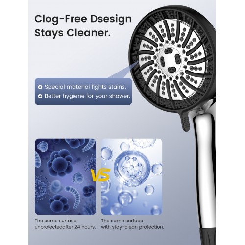 High Pressure & Water Saving: Enjoy a powerful, invigorating shower experience even in low-pressure homes. Our filter shower head features advanced pressure-boosting technology that increases water flow by up to 200%. The self-cleaning silicone nozzles help prevent limescale build-up, ensuring consistent performance and easy maintenance—ideal for flats, caravans, and hard water areas